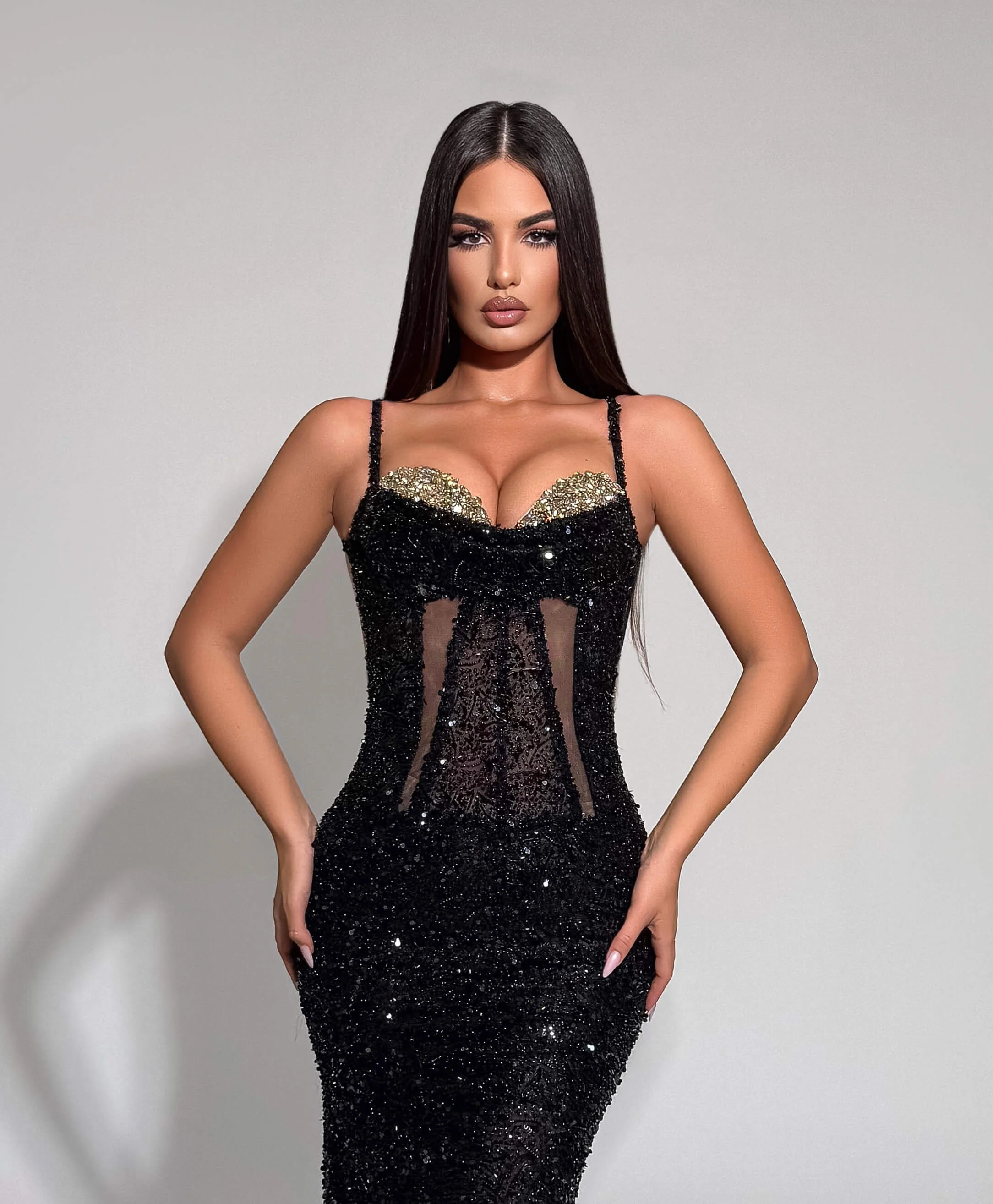Elegant black gown with a sheer corset bodice and golden cup detail.