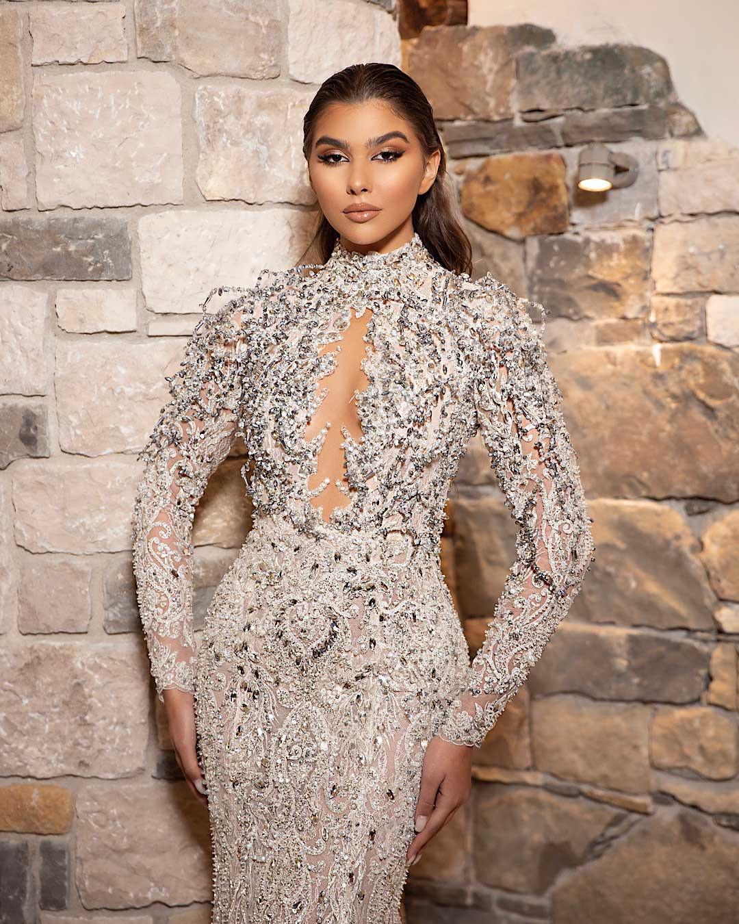 Halter neck dress with silver handsewn beading and crystals, featuring a long train on the back.